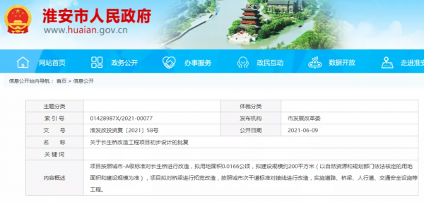 近日,淮安市发改委发布又一座桥项目初步设计批复来啦!快来看看位置在哪