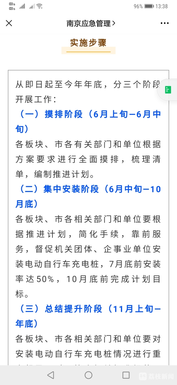 除了企业,一些学校等事业单位内,也按照要求设置充电桩,有效保障广大职工电动自行车“吃饱了回家”。“早上七点钟自动通电,下午一点就自动断电了,这样就可以防止电动车充电时间过长,导致过热引起火灾,我们还配备了一个探头专门对着充电区。”南京小行小学安全员金炳羽说。 南京长虹路社区副主任周娴告诉记者,“ 企业职工骑电动车比较多,我们跟负责人讨论,因地制宜,采取方式。老旧小区有460充电桩射头,满足一千多辆电动车充电,辖区企业我们都会要求设立充电桩,严禁企业员工把电动车带到厂区充电。”根据《方案》,南京全市机关团体、企事业单位电动自行车充电设桩建设,不应占用建筑防火间距、消防车道、消防车登高操作场地,不应影响消防设备、安全疏散设施的正常使用。据了解,南京市安委办已将安装电动自行车充电桩推进情况纳入安全生产考核,制定考核细则,定期调度推进,确保在年内推进到位。