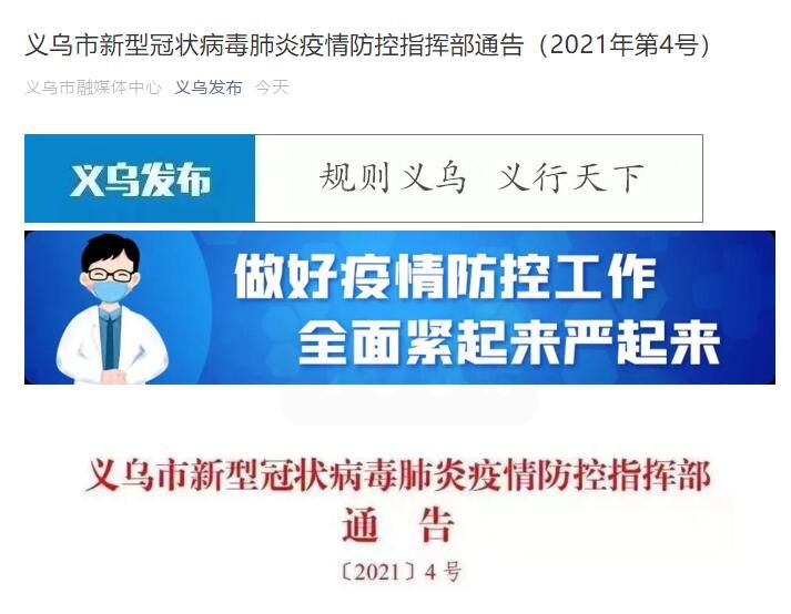 荔枝新闻讯 据浙江省义乌市人民政府新闻办公室微信公众号“义乌发布”今日消息,义乌市发布新型冠状病毒肺炎疫情防控指挥部通告(2021年第4号),全文如下: