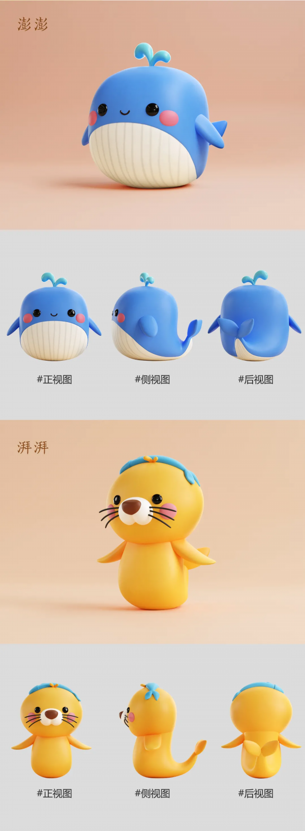 据视界互联视觉团队负责人介绍,“澎澎”和“湃湃”的IP形象设计保留了鲸鱼和海豹的动物属性,其中体型及五官设计上用了减法,让整体更加简约,用几何形去概括。IP形象在动物属性、拟人化以及大众喜闻乐见的元素中寻求平衡点,简约可爱的IP形象在后期各个场景中都可以方便应用。