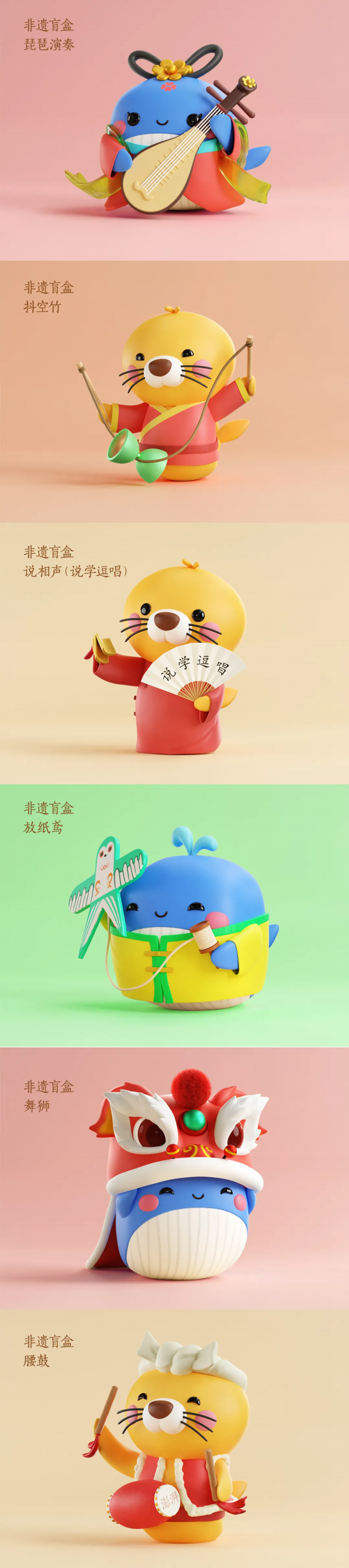 新潮撞见非遗,会闪烁出怎样的火花?本次盲盒设计选取了非物质文化遗产中的六个进行延展设计,其中有琵琶演奏、相声、舞狮、抖空竹、腰鼓以及纸鸢(风筝),并且融合了一些传统的服装及道具元素,非遗+盲盒,让非遗活态传承又有了新玩法。