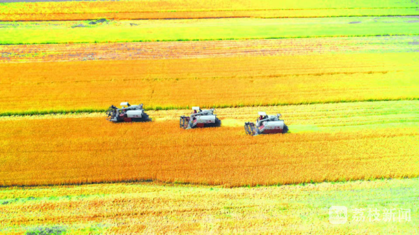 党旗红、麦浪黄,这丰收的场景,记录着劳动人民的幸福生活,演绎着新时代田园欢歌,也记录着百年大党带领人民从富起来到强起来的时代巨变。