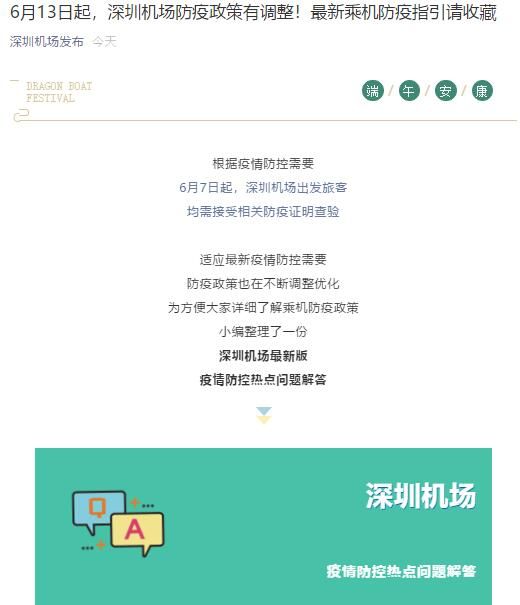 荔枝新闻讯 深圳市机场(集团)有限公司微信公众号“深圳机场发布”今日发布深圳机场防疫政策新调整:6月13日起,旅客安检须接受“健康码”、核酸检测阴性证明、“行程码”检验。