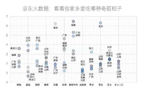 甜咸粽子的南北之争是每年都要上演的话题,但如今,已经不那么重要了。眼下任何东西都可以放进粽子,如辣白菜五花肉、意式肉酱、松茸松露、菌菇、鳗鱼等等,尤其是鳗鱼、松茸鸡肉、鲍鱼干贝等高端食材的需求旺盛,国民消费能力一路看涨,不过,总体上看,猪肉、红枣、豆沙、蛋黄等依然是粽子馅的主力军,但口味奇特的越来越受欢迎,京东上,螺蛳粉、榴莲、臭豆腐这三种粽子今年5月1日至今成交金额同比增长2.8倍。京东公关工作人员王秀廷介绍说,数据还发现,越是“正常”口味的粽子,比如蛋黄、紫米、芝士等,各省区的偏好差异越小,也就是大家接受度都差不多;而越是奇葩的口味,区域差异越大,也越能说明不同地域人们对美食的不同追求。“鲍鱼、松茸、松露这些基本都集中在广东地区。”