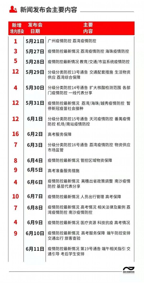 从5月27日开始,广州每天举行一场疫情防控发布会,用“老百姓听得懂的话,真正回应百姓关切”。22天17场发布会,内容日渐丰富。从每天例牌的疫情数据和防控措施,到生活物资供应保障、交通出行配套,再到高考保障、科技支撑、端午安排……发布会直面市民关注的焦点,应时发布,干货满满。