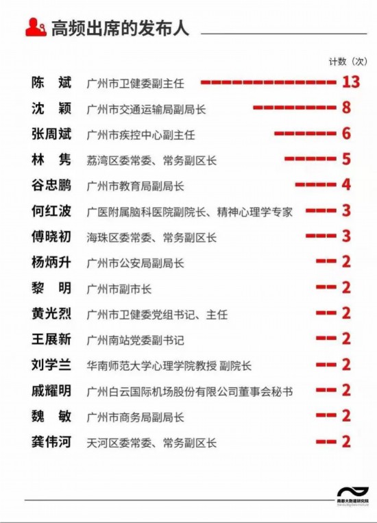 市卫健委副主任陈斌13次参加发布会,成为媒体最熟悉的面孔。她用沙哑的声音通报最新病例情况、核酸检测情况、疫情管控措施,清晰有力,干货满满。市交通运输局副局长沈颖8次出席发布会,向社会通报防控区域交通安排、离穗出省政策变化、特殊考生接送安排等,提供出行权威信息。此外,市疾控中心副主任张周斌6次出席发布会,在疫情流调、疫苗接种、市民防护等方面答疑解惑,传递专业声音。