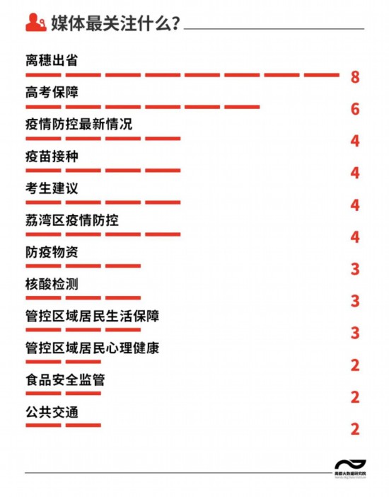 17场疫情防控新闻发布会,吸引中央、省、市等多家主流媒体参会,并同步对发布会进行线上全程直播。南都大数据研究院统计发现,现场共有12家媒体提问66次。其中,“离穗出省”最受媒体关注,共有8次提问涉及。高考保障也是媒体关注的焦点,共有6次提问涉及。此外,广州疫情防控、荔湾疫情防控、疫苗接种、考生建议等也受到媒体较多关注。