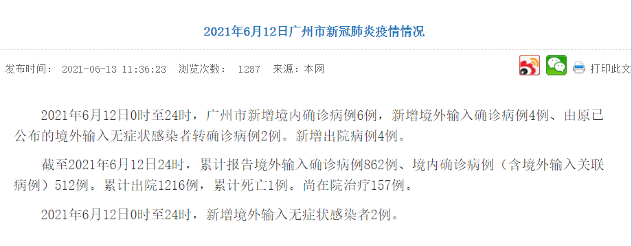 荔枝新闻讯 据广州市卫健委网站通报,2021年6月12日0时至24时,广州市新增境内确诊病例6例,新增境外输入确诊病例4例、由原已公布的境外输入无症状感染者转确诊病例2例。新增出院病例4例。