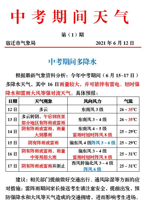 小编从宿迁市气象部门获悉,今年中考期间(6月15日至17日),宿迁多降水天气,其中16日雨量较大,并可能伴有雷电、短时强降水和雷雨大风等强对流天气。