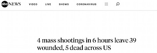 据美国广播公司(ABC)13日报道,在刚刚过去的周末,美国至少4个主要城市发生了大型枪击案,造成至少39人受伤,5人死亡。