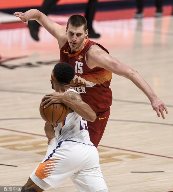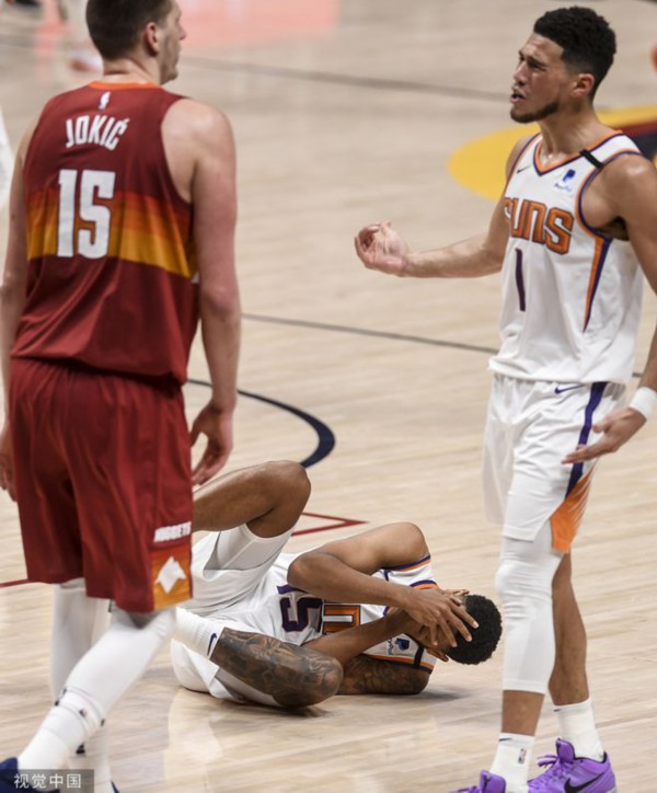 掘金进攻不中,佩恩后场接到队友传球,约基奇上前扑抢,切球时切到了佩恩的面部,佩恩痛苦倒地,布克冲上来和约基奇理论,双方险些发生冲突。