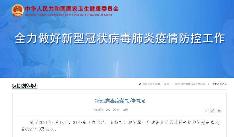 据国家卫健委网站消息,截至2021年6月13日,31个省(自治区、直辖市)和新疆生产建设兵团累计报告接种新冠病毒疫苗89277.0万剂次。