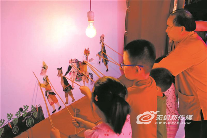 二泉映月广场上,小朋友在非遗文化传人的指导下表演皮影戏《西游记》。