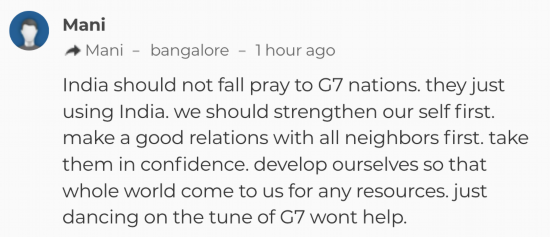 在《印度时报》评论区,有人宣称“非常欢迎”印度这一举动。不过也有网友对此看衰,并表示“印度不应该成为G7的牺牲品,他们只是在利用印度。我们应该先加强自身,先和所有邻国搞好关系……发展自身,这样全世界就会来找我们要资源。按照G7的调子起舞没有用。”↓