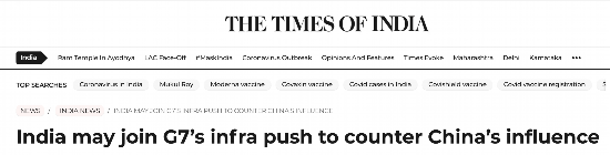 印度也想加入?《印度时报》14日以“印度可能加入G7基建推动来对抗中国”为题报道称,印度13日暗示其可以考虑加入七国集团(G7)的所谓“重建更好世界”计划。据此前外媒报道,该计划旨在帮助较贫困国家建设基础设施的计划,提供所谓“价值驱动、高标准、透明”的伙伴关系,对抗中国的“一带一路”倡议。