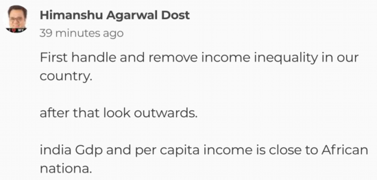 还有网友让印度先管好自己国内问题:“先着手处理和消灭我们国家的收入不平等,然后再向外看。印度的GDP和人均收入跟非洲国家差不多。”