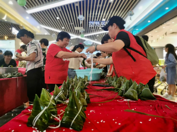 6月13日,七星湖社区、星湖001商业中心联合主办的第三届百人包粽赛在星湖001商业中心举办。巧手阿姨和志愿者们现场共包的近千个爱心粽分别被送到韩洋敬老院、特殊教育学校、宁海路消防救援站和辖区困难群众家中。