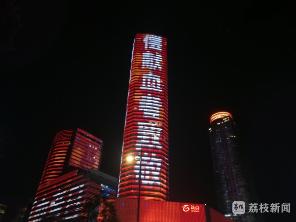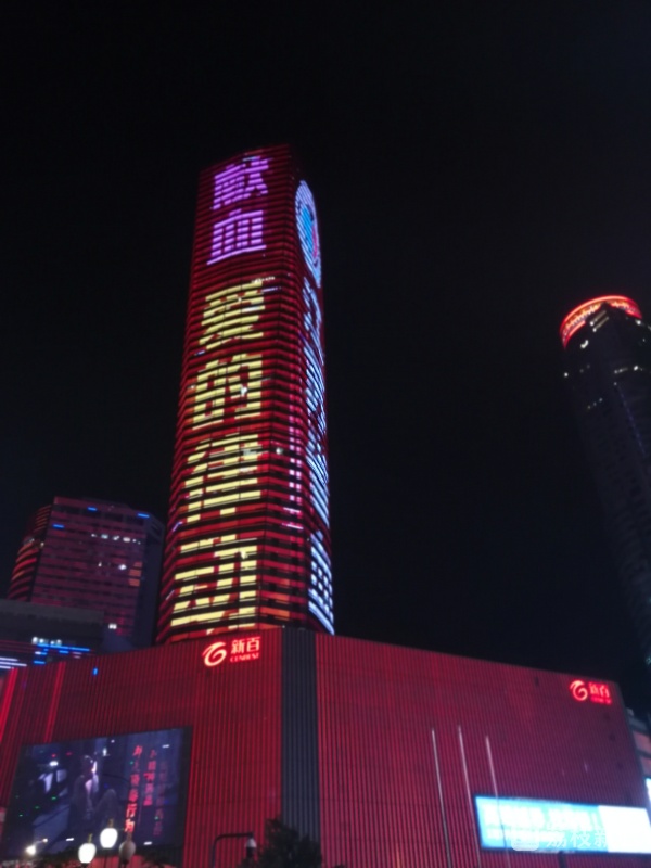 20点整,三处地标建筑准时亮起了红色的灯光,并滚动播放 "献血 爱的律动"" 向无偿献血者致敬" 等文字。现场有不少市民驻足观望与拍照。