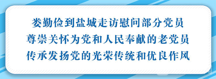 荔枝新闻讯 建党100周年即将到来之际,江苏省委书记娄勤俭日前到盐城走访慰问部分获得党内功勋荣誉表彰的党员、生活困难党员、老党员等,转达党中央的关怀和温暖,代表省委向他们致以亲切问候和崇高敬意。娄勤俭希望全省广大党员要传承党的光荣传统和优良作风,不忘初心牢记使命,薪火相传不懈奋斗,坚决扛起习近平总书记赋予江苏的“争当表率、争做示范、走在前列”重大使命,奋力在新征程上谱写好“强富美高”新江苏现代化篇章。