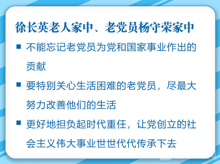 今年71岁的老党员杨守荣已有51年党龄,曾多次被评为优秀共产党员,前几年因病导致生活不能自理,常年需要照顾。娄勤俭来到他的家中慰问,给他戴上“光荣在党50年”纪念章并送上慰问金。娄勤俭详细询问他的日常生活、医疗保障等情况,嘱咐当地干部要特别关心生活困难的老党员,尽最大努力改善他们的生活,让他们充分感受到组织的温暖。娄勤俭说,我们党带领全国各族人民团结奋斗,从站起来、富起来走向了强起来,在这个奋斗过程中,一代一代共产党人前仆后继、英勇奋斗,用实际行动践行初心使命。我们要充分弘扬党的光荣传统,更好地担负起时代重任,让党创立的社会主义伟大事业世世代代传承下去。
