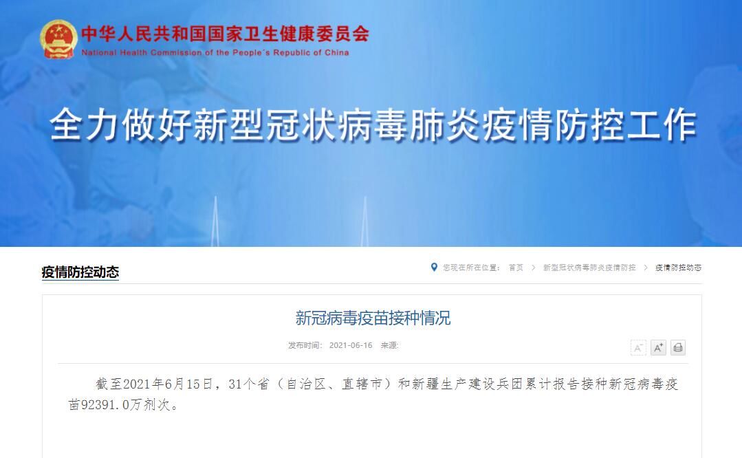 截至2021年6月15日,31个省(自治区、直辖市)和新疆生产建设兵团累计报告接种新冠病毒疫苗92391.0万剂次。