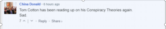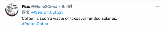 “汤姆·科顿又在宣扬他的阴谋论了,可悲。”