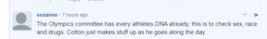 也有网友表示,奥委会已经收集了每位运动员的DNA,并批评科顿胡编乱造↓