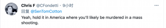科顿最新博人眼球的言论随即也在网上引发关注,不过大多数美国网友并不傻,纷纷嘲讽科顿的言论耸人听闻、愚昧无知。有网友说:“汤姆·科顿又在宣扬他的阴谋论了,可悲。”