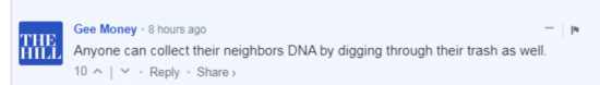 还有网友讽刺称,“(按照科顿的说法)任何人都可以通过挖掘邻居的垃圾来收集他们的DNA。”↓