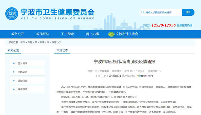荔枝新闻讯 据浙江省宁波市卫健委网站消息,6月16日0—24时,宁波市新增境外输入无症状感染者1例,为乌克兰籍,外籍货轮船员,美国输入,其随船同行密切接触者均在船上隔离医学观察,在宁波市无密切接触者。(总台记者 曹美丽 杜金明)