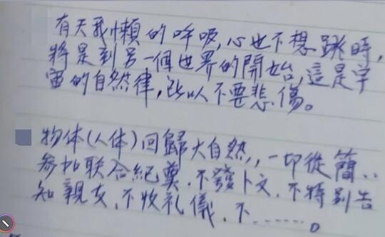 报道称,林女士住在外地的女儿突然接到她传来的信息,只见纸上写着:生生息息,一切顺其自然!感谢天地给我的一切,有你们的陪伴真幸福。有天我懒得呼吸,心也不想跳时,将是到另一个世界的开始,这是宇宙的自然律,所以不要悲伤……林女士还交代,一些东西放在哪里、房子如何处理、不发讣闻、不特别告知亲友等。
