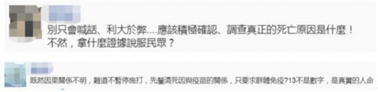 对此,有岛内网友讽刺陈时中:别只会喊话“利大于弊”,应该积极确认、调查真正的死亡原因是什么,不然,拿什么证据说服民众?还有网友说,既然因果关系不明,难道不暂停施打,先厘清死因与疫苗的关系?“13不是数字,是真实的人命”。↓