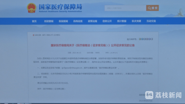 《医疗保障法(征求意见稿)》意见反馈截止时间为2021年7月16日。市民可以登录国家医疗保障局官网了解情况积极参与,提出自己的宝贵意见。