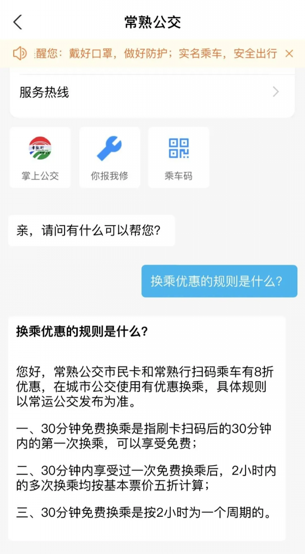同时,常熟公交上线智能云客服“小常”,它具备实时公交查询、电子站牌报修、公交信息推送等功能,可以根据问题给出判断,自动归纳问题,对百姓们提出的问题一一进行引导回答,既是对答如流的公交“小二”,也是多重问题的“管理大师”。