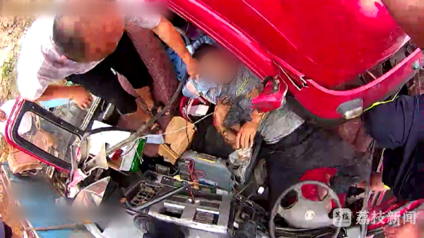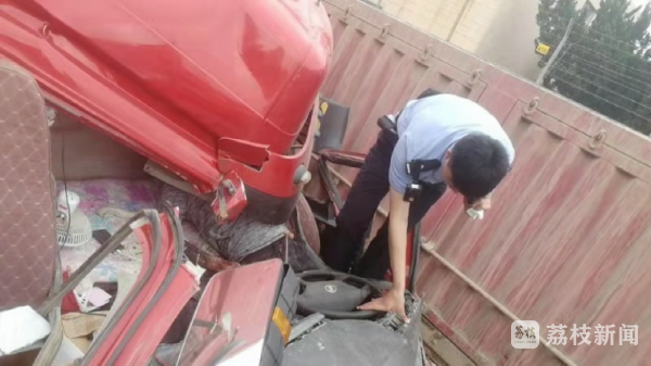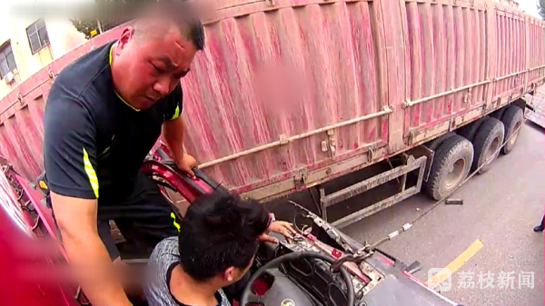 民警和周围群众一起,硬生生将压在驾驶员腿上的方向盘掰断,可驾驶员上身仍被卡在了座位和驾驶舱之间。随后,道路救援车辆到现场,救援人员用救援车上的钢丝绳将货车车头拉开,将驾驶员救出。