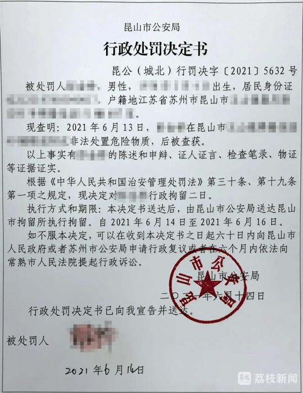 最终,胡某因非法处置危险物质被昆山警方依法行政拘留。