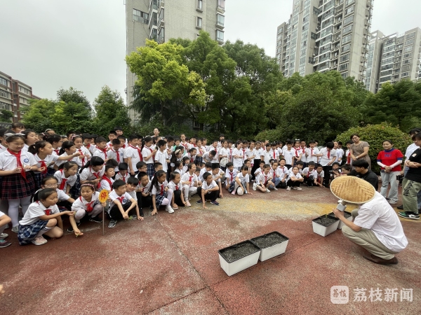 一大早,南京理工大学实验小学实践园内非常热闹,学校三年级的学生们迎来了十岁成长礼。大家排好队,每个人手中都举着水稻秧苗,江苏省农科院副研究员白红武将带着他们学插秧。“你们用手指头插进去,大约可以插半指头深,把秧苗放进去,最后要捏一下,让它紧紧的相连。我们每个班大约可以种48株,收获的时候可能是56株,甚至更多,这是为什么呢?奇妙的事情发生了,水稻可以不断的分裂,这就是大自然的魔法。”