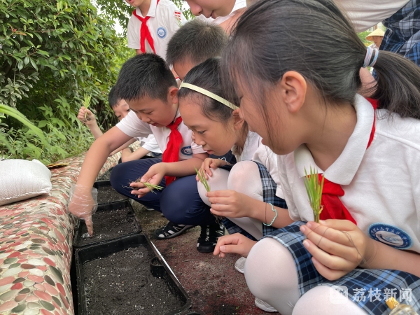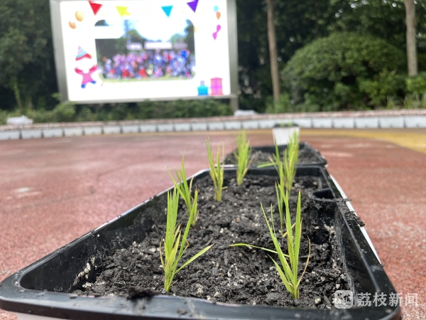 三(2)班学生卢思朵说:“我们刚刚在种水稻,知道了种水稻的过程,先要有苗,再用手戳一个洞,把水稻放进去,捏下就好了,好玩。”