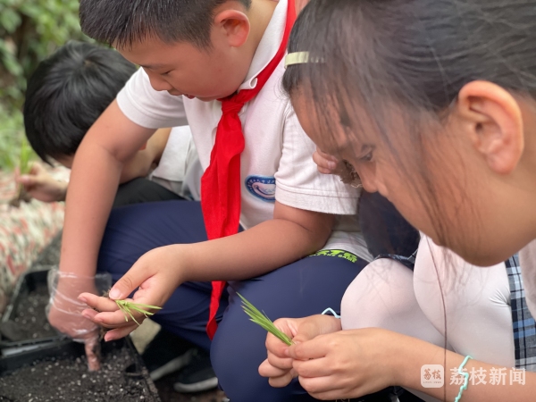 白红武一边讲解,一边给孩子们示范。他说,让孩子们通过水稻的种植体会到不一样的生命力。“这个苗是我们农科院培育的南粳46,我们的目标是孩子们在秋天收获,学会一个小本领,增加一门小技术,成长一些小信心。”
