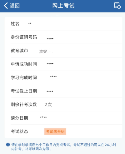 驾驶人应在学时学满后7个工作日内完成网上考试;考试未通过的,可以在24小时内补考,补考以2次为限;逾期或补考不合格的,只能重新申请“学法减分”。