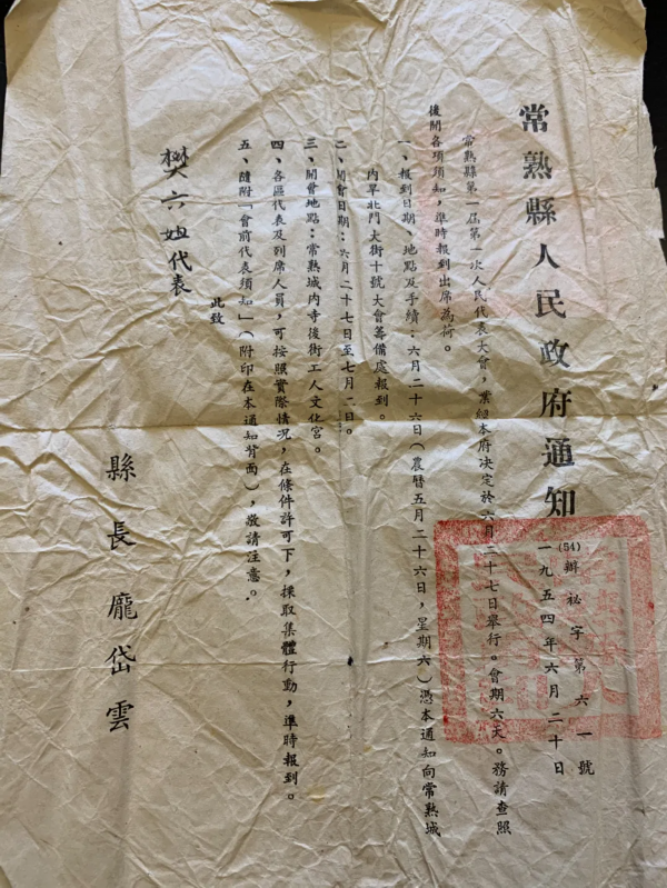 这张证书如今已经被常熟博物馆征集作为藏品,虽然纸张已经微微泛黄,但保存得十分完整,上面的字迹和印章仍清晰可见,同时被征集的还有当时县长庞岱云署名的常熟县第一届人民代表大会第一次会议召开通知书。