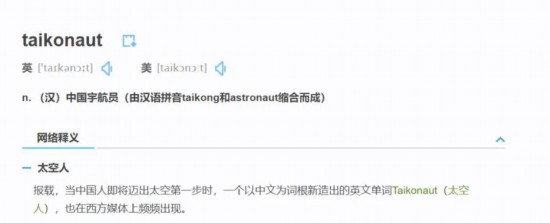 据了解,“Taikonaut”是由中文“太空”的拼音和英语单词astronaut混成的拼缀词。目前该词也被牛津词典收录,意思为Chinese astronaut(中国宇航员)。
