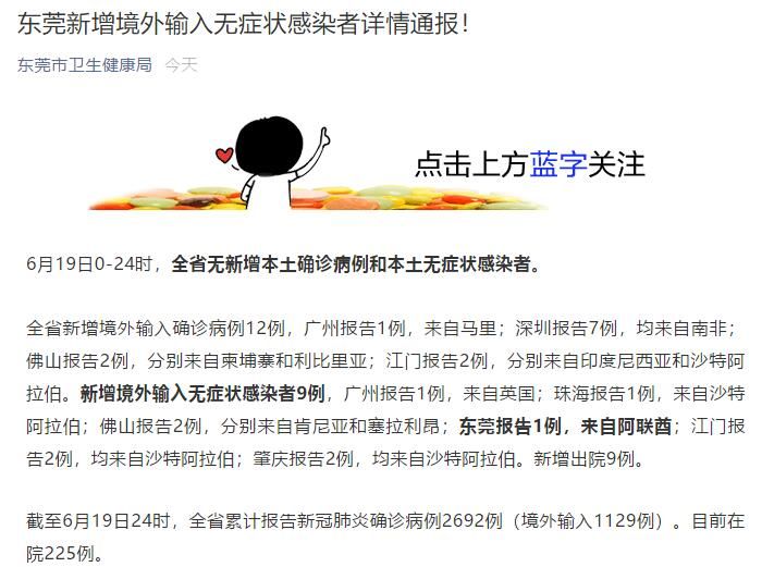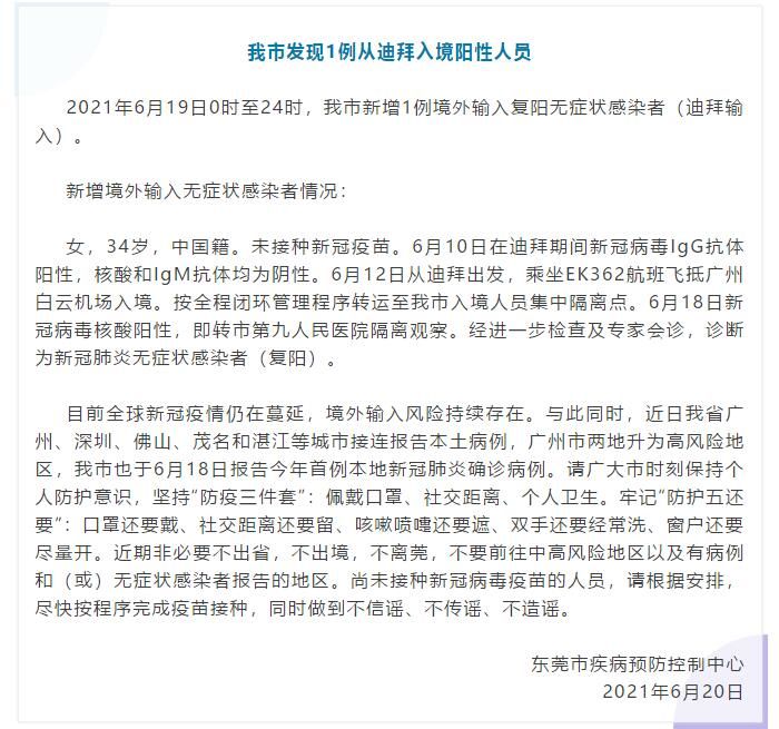 荔枝新闻讯 广东省东莞市卫生健康局微信公众号今日发布一则“东莞新增境外输入无症状感染者详情通报!”,内容称:2021年6月19日0时至24时,东莞市新增1例境外输入复阳无症状感染者(迪拜输入)。