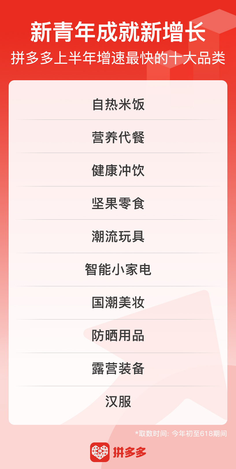▲ 拼多多发布今年初至618期间增长最快的十大消费品类,上半年拼单量增幅位列前三的快消品类均与“吃”相关。