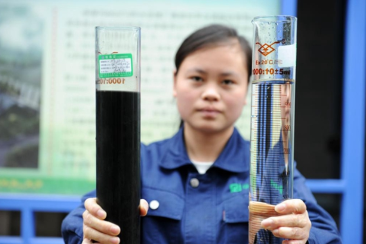 位于赤水河流域的贵州省仁怀市茅台酒厂污水处理厂的工人展示污水处理前后的水质对比效果。新华社记者 杨文斌 摄