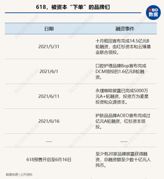 据公开资料不完全统计,618预售开启至6月16日,至少有20家品牌披露获得融资。从天使轮到D轮,融资金额从几百万元人民币到数亿美元不等,总融资额至少数十亿元人民币。