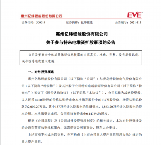6月20日晚间,锂离子电池巨头亿纬锂能发布公告称,公司与特锐德及其控股子公司特来电新能源股份有限公司(以下简称“特来电”)签订了《股份认购协议》(以下简称“本协议”),公司拟作为战略投资者,以人民币14.60元/股的价格认购特来电本次增发股份中的137万股股份,增资认购总价款为2000.20万元,其中137万元计入特来电的注册资本,1863.20万元计入特来电的资本公积。