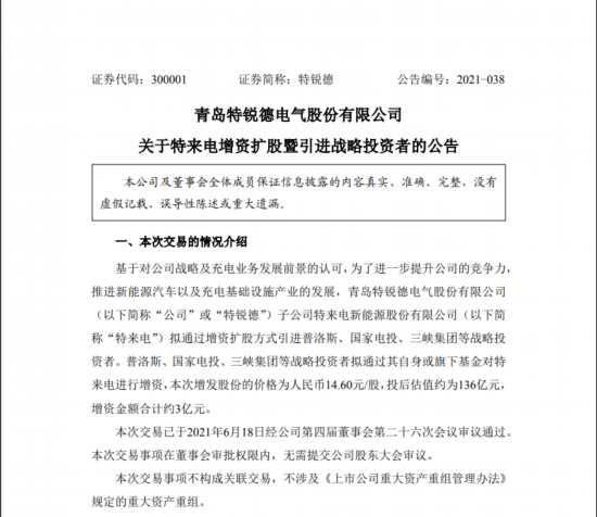与此同时,特锐德也发布公告称,基于对公司战略及充电业务发展前景的认可,为了进一步提升公司的竞争力,推进新能源汽车以及充电基础设施产业的发展,青岛特锐德电气股份有限公司(以下简称“公司”或“特锐德”)子公司特来电新能源股份有限公司(以下简称“特来电”)拟通过增资扩股方式引进普洛斯、国家电投、三峡集团等战略投资者。普洛斯、国家电投、三峡集团等战略投资者拟通过其自身或旗下基金对特来电进行增资,本次增发股份的价格为人民币14.60元/股,投后估值约为136亿元,增资金额合计约3亿元。本次交易已于2021年6月18日经公司第四届董事会第二十六次会议审议通过。本次交易事项在董事会审批权限内,无需提交公司股东大会审议。