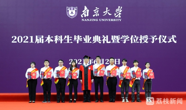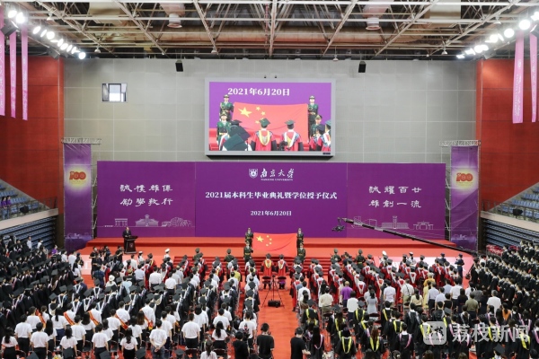 毕业典礼现场,全体毕业生进行毕业宣誓。王志林宣读《南京大学关于授予学士学位的决定》。学校领导、院士、人文社科荣誉资深教授、资深教授、校学位评定委员会委员、院系领导和院系学位评定委员会委员为学士学位获得者颁发学位证书。