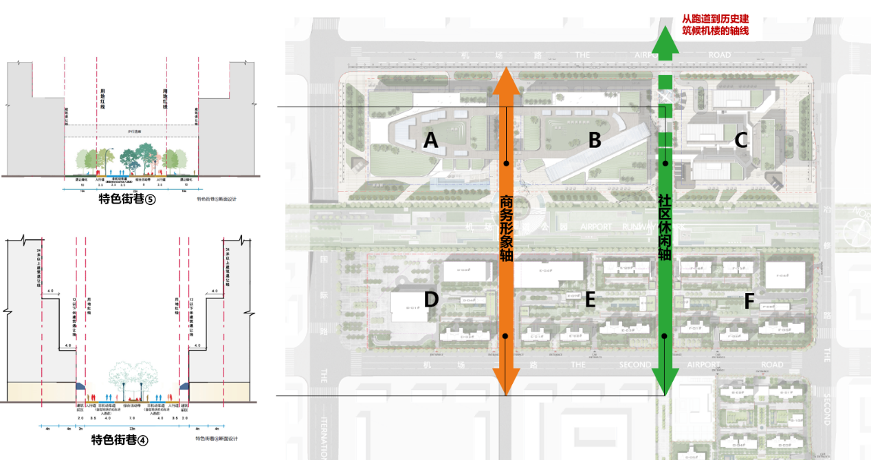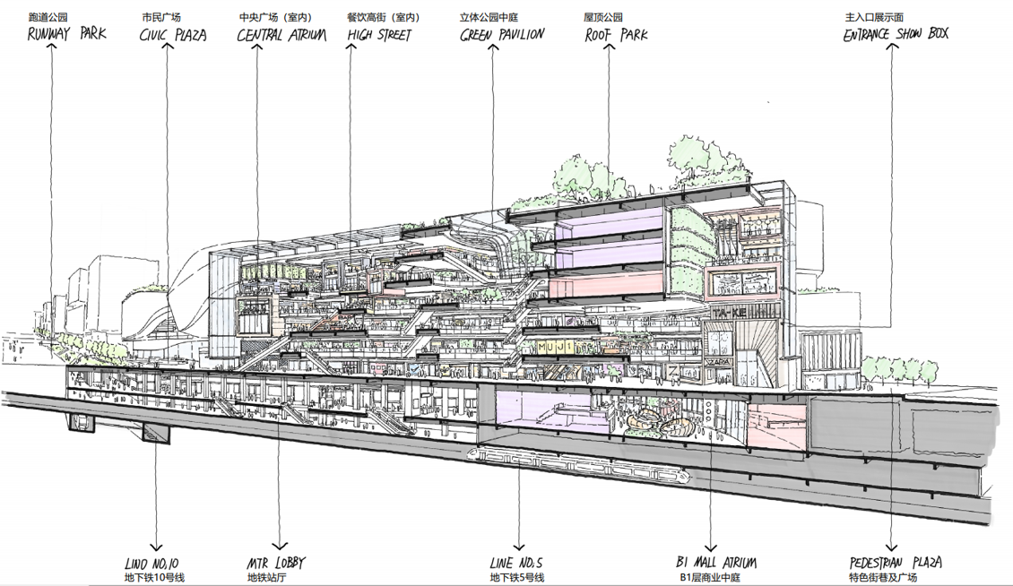 同时,结合地铁出入口,充分利用下沉广场空间,强化沿跑道界面的立体活力空间塑造。